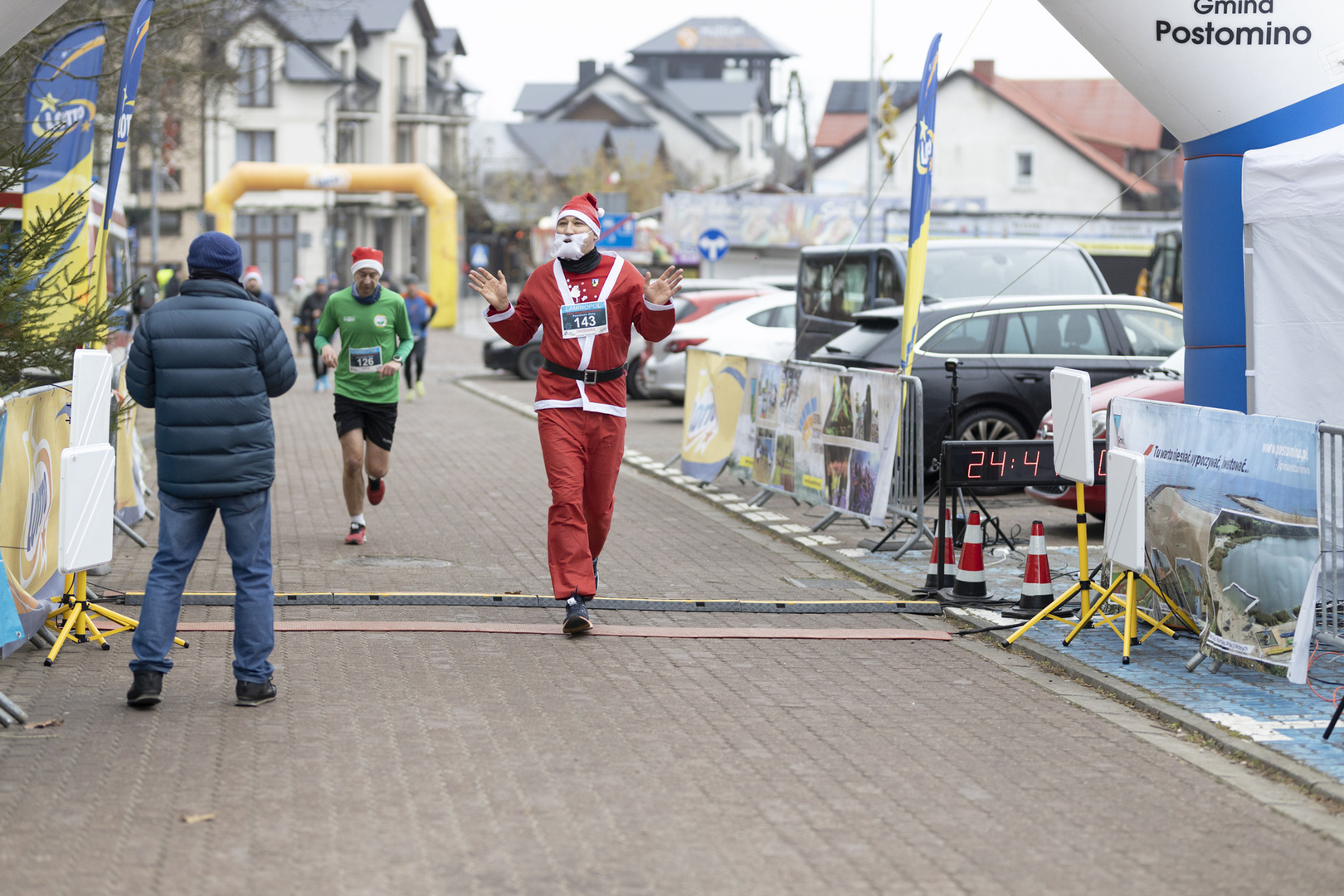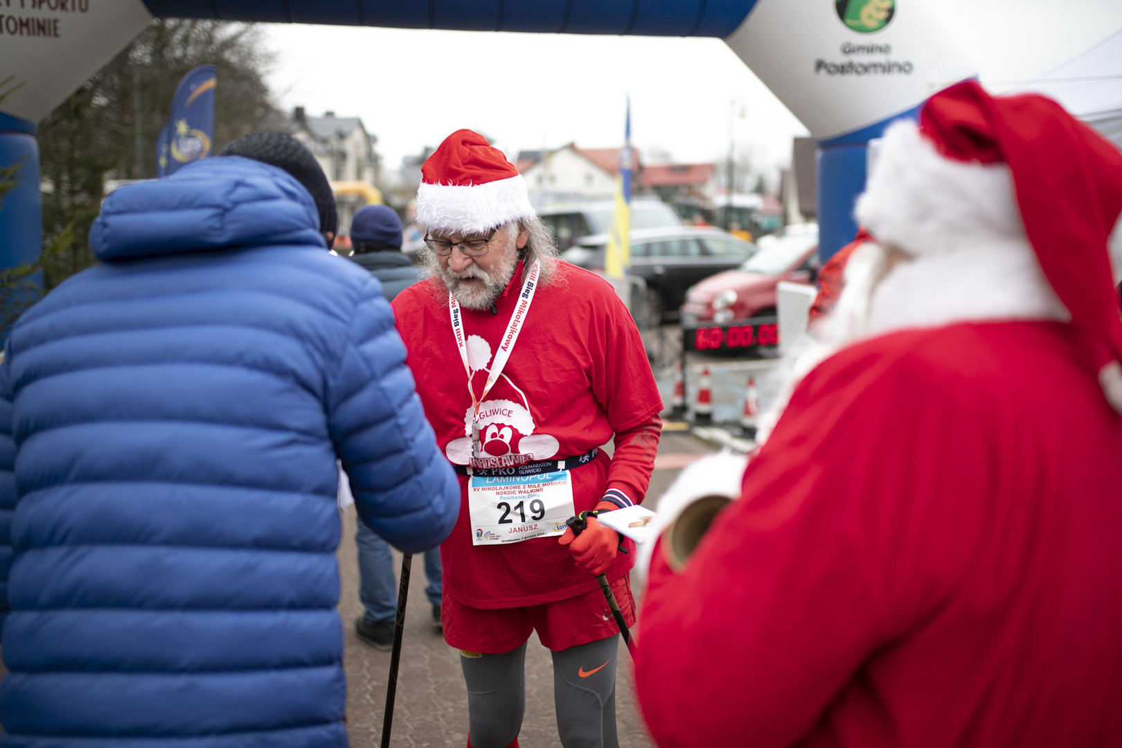 Na mecie nie mogło zabraknąć Świętych Mikołajów, w rolę których wcieliły się Pani Daniela Igras oraz Alicja Kukowska. Na mecie wręczyli wszystkim uczestnikom kończącym bieg pamiątkowe medale oraz przepyszne czekolady. Starterami poszczególnych biegów byli: Janusz Bojkowski - Wójt Gminy Postomino, Aleksandra Kurek - Zastępca Wójta Gminy Postomino, Marek Leśniewski – Dyrektor Centrum Kultury i Sportu w Postominie, Łukasz Zięba - Radny Gminy Postomino, Piotr Grzeszczak - prezes firmy Laminopol Sp. z o. o., Maciej Hope - Dyrektor Szkoły Podstawowej w Jarosławcu, Maksymilian Kwiatkowski - właściciel Muzeum Bursztynu w Jarosławcu, Bogdan Szlawski - prezes GPK w Postominie oraz Zdzisław Ludwikowski – pomysłodawca Biegu Mikołajkowego.